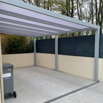 Carport accolé "Elegance" Dim. : 3.60 m x 7.00 m = 25.2 m² Toit 1 pente 7% Couverture polycarbonate - petites alvéoles opales Pose sur …